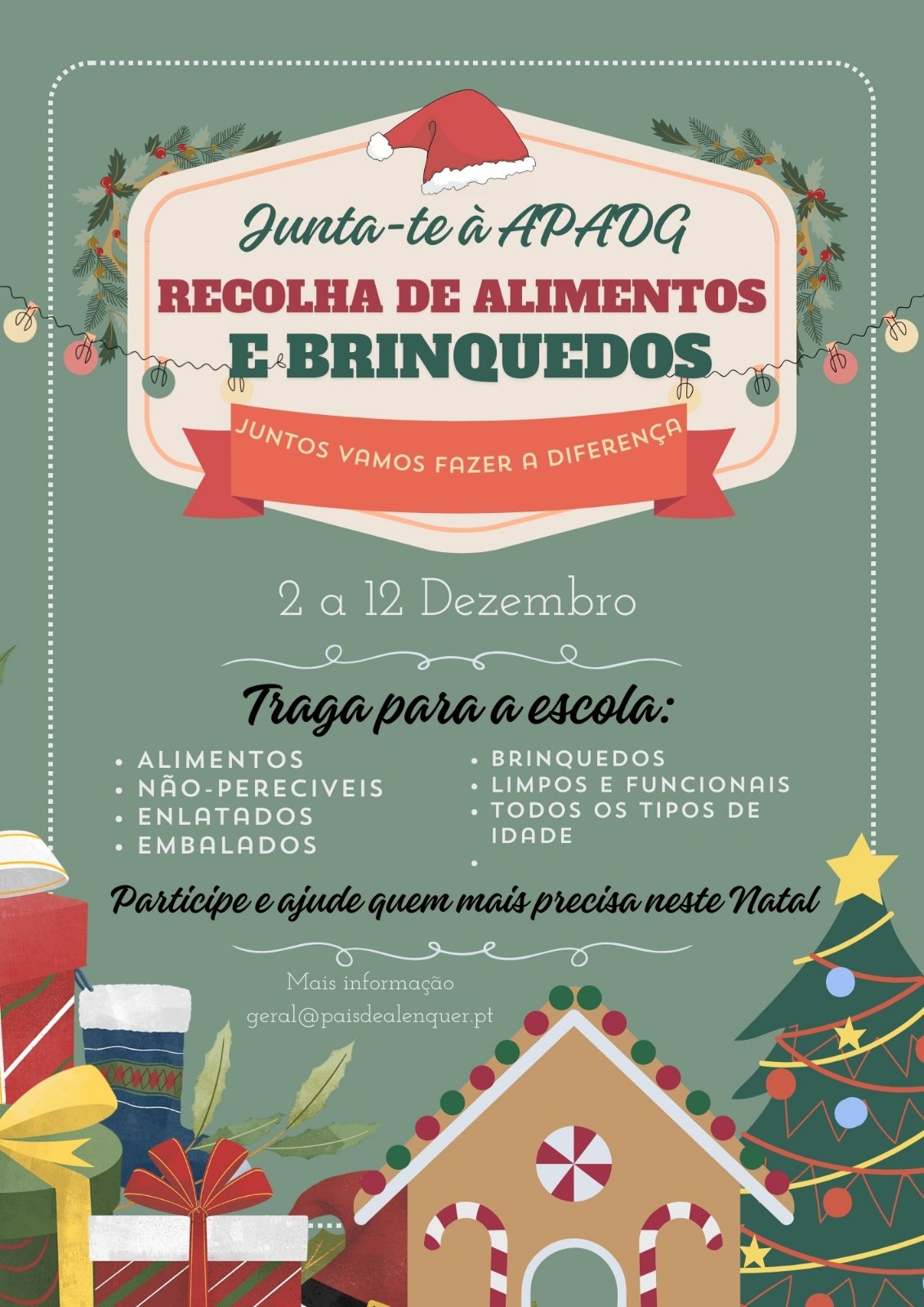 A APADG está a dinamizar, entre uma campanha de recolha de alimentos e brinquedos nas escolas do Agrupamento. Esta iniciativa integra o nosso plano anual de atividades, no eixo da solidariedade e multiculturalidade, reforçando o espírito de entreajuda e comunidade nesta época festiva.